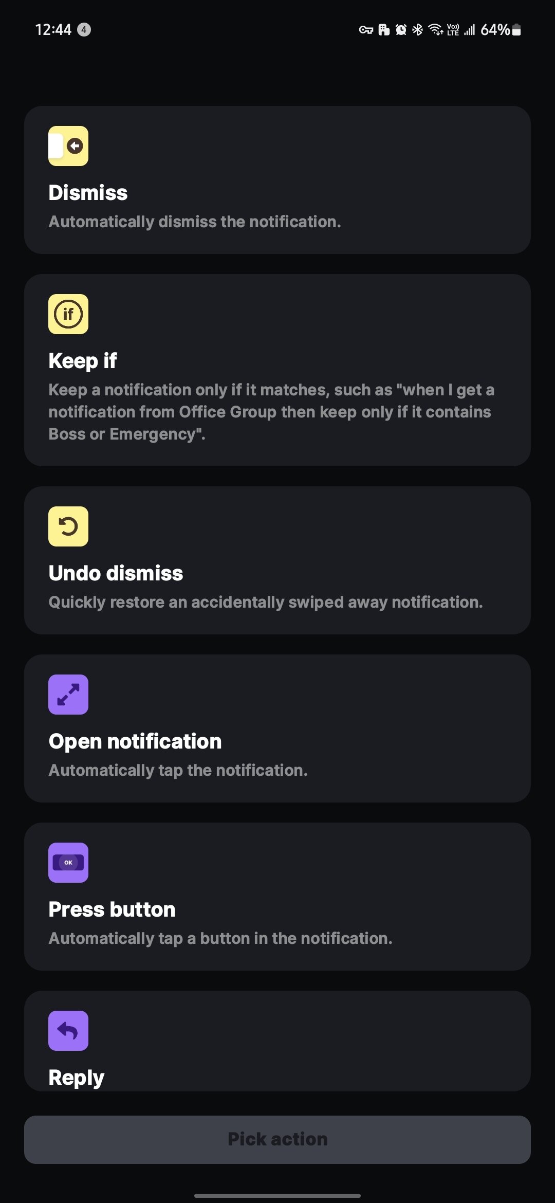 The heart of the app is its list of actions available to reign in chatty apps, privilege important alerts, or trigger various phone settings. These include simple actions like Dismiss, which automatically clears that notification; Secret, which obfuscates the content of a notification; and Speak, which reads the notification aloud. You can even trigger your device’s flashlight, sound its alarm, or have the app automatically reply to your messages. There are 25 actions available, one of which allows users to trigger a Tasker recipe. So, in theory, there are hundreds of possible actions available.